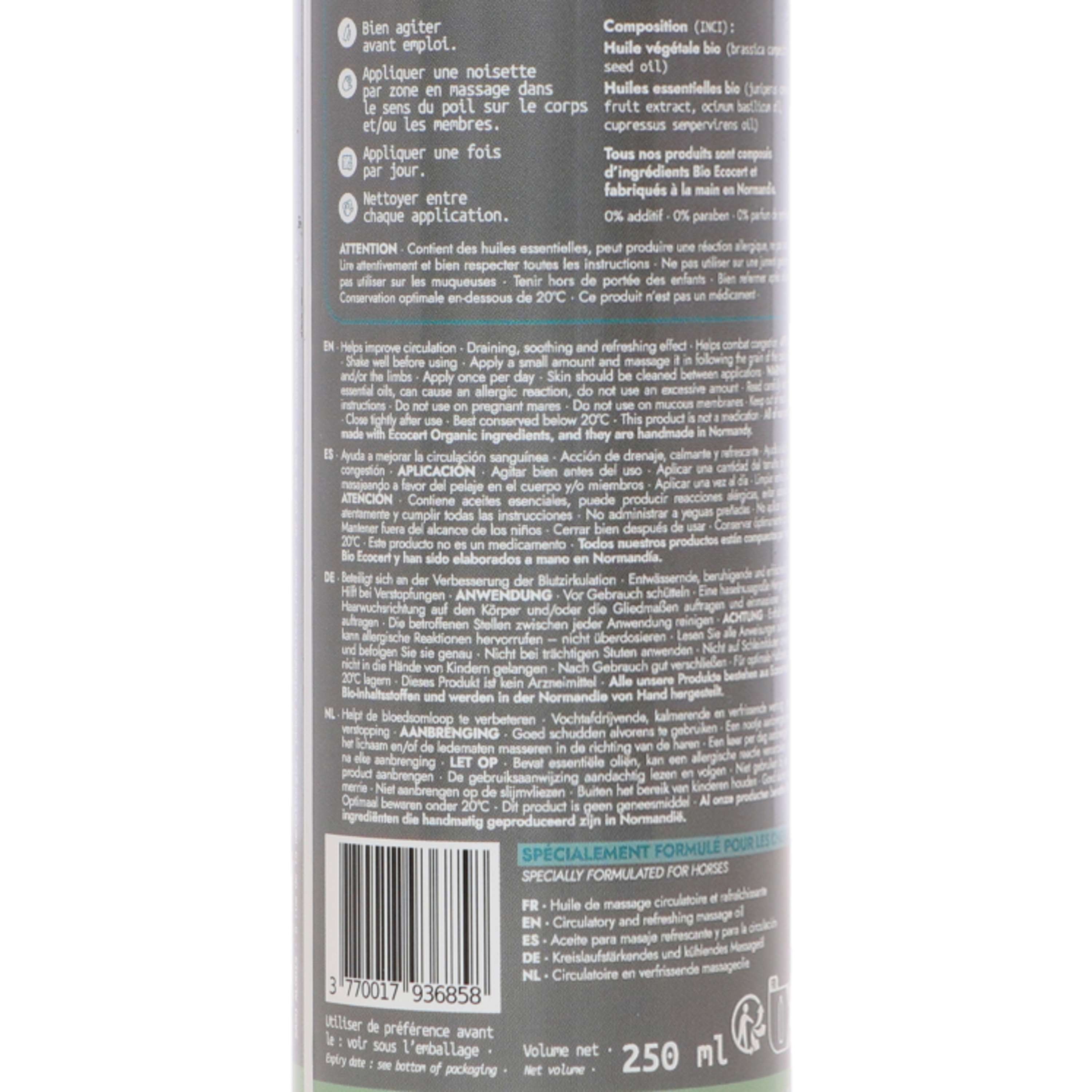 Cette huile est élaborée avec des huiles essentielles et de l'huile végétale de Brassica napus. Grâce aux huiles essentielles de Cupressus sempervirens et Cedrelopsis grevei, ton cheval profitera d'un effet rafraîchissant et apaisant.
