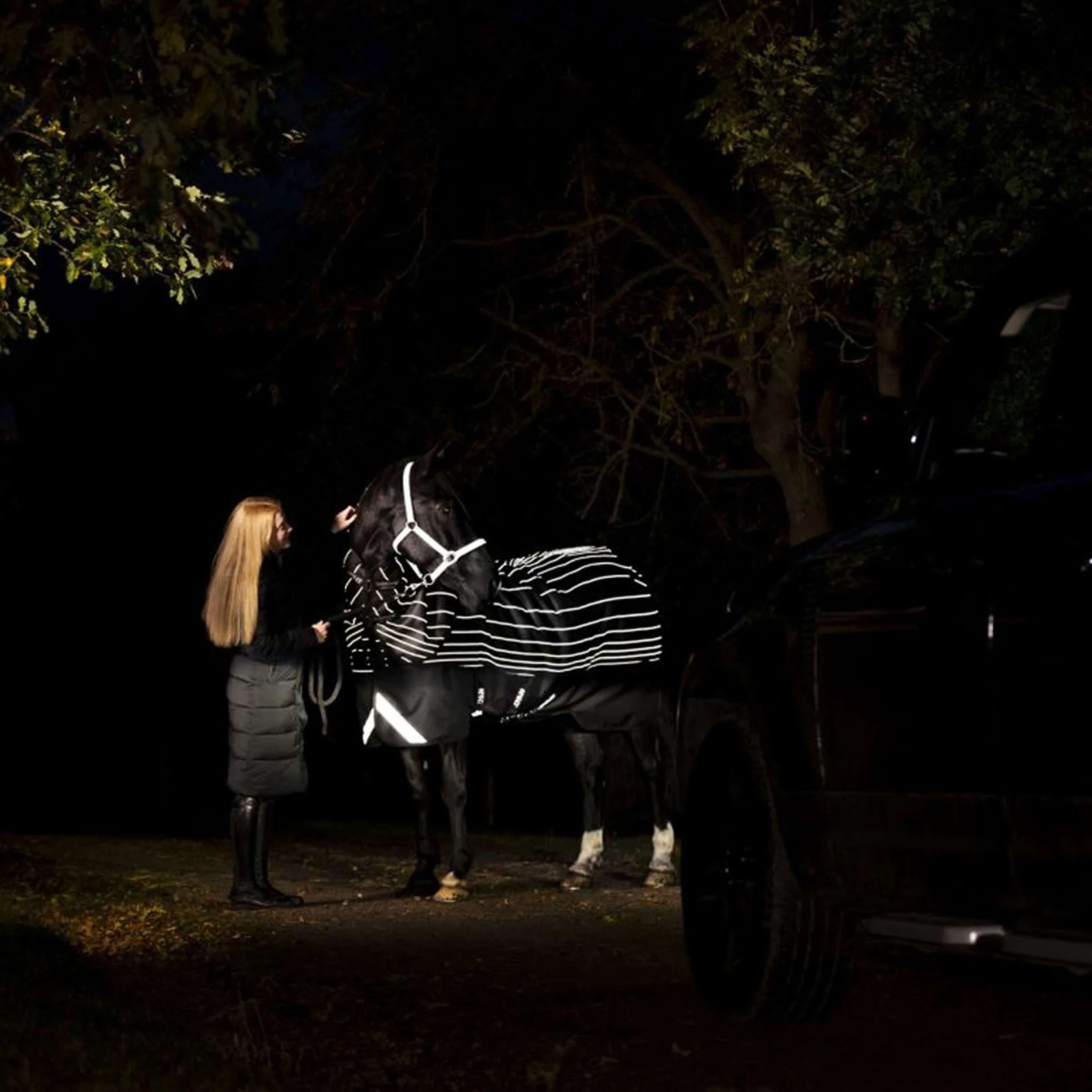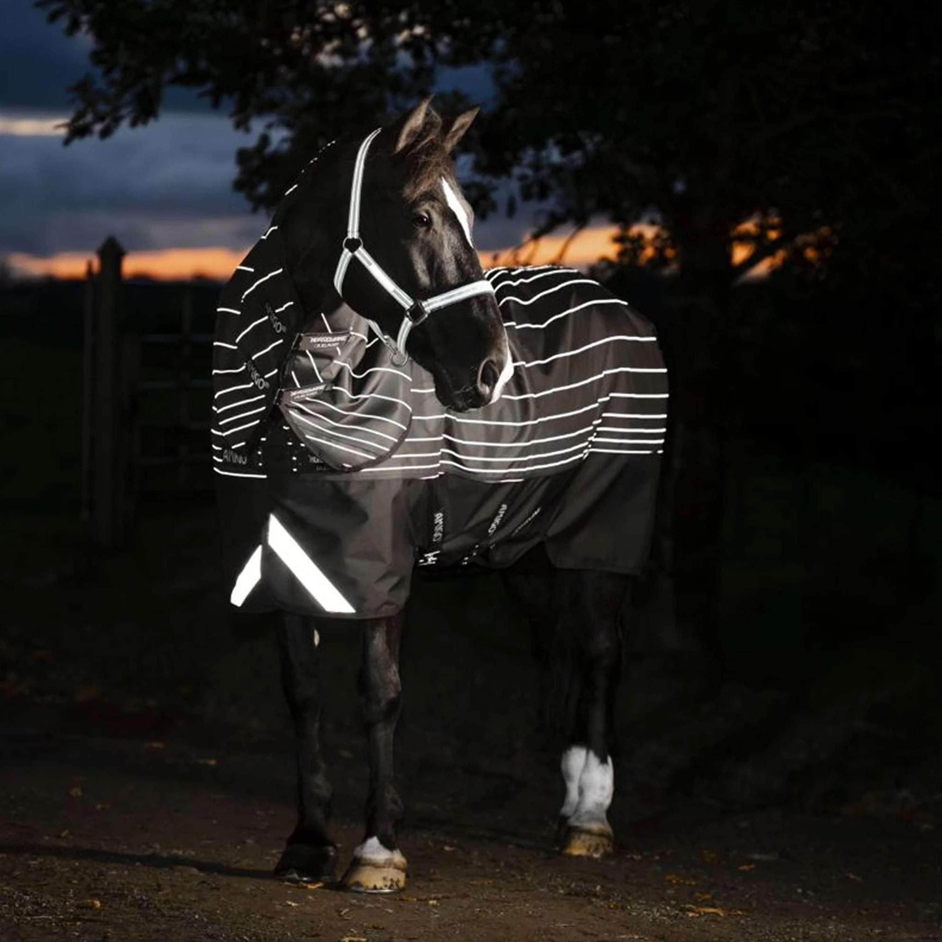 L’Amigo 1200D FieldSafe Reflectech Plus Turnout est fabriqué à partir d’un extérieur imperméable et respirant en polyester 1200D résistant qui intègre un fil réfléchissant entrelacé qui s’illumine de manière frappante à tout contact léger, créant un effet de lueur dans l’obscurité et rendant le cheval clairement visible dans des conditions de faible luminosité.