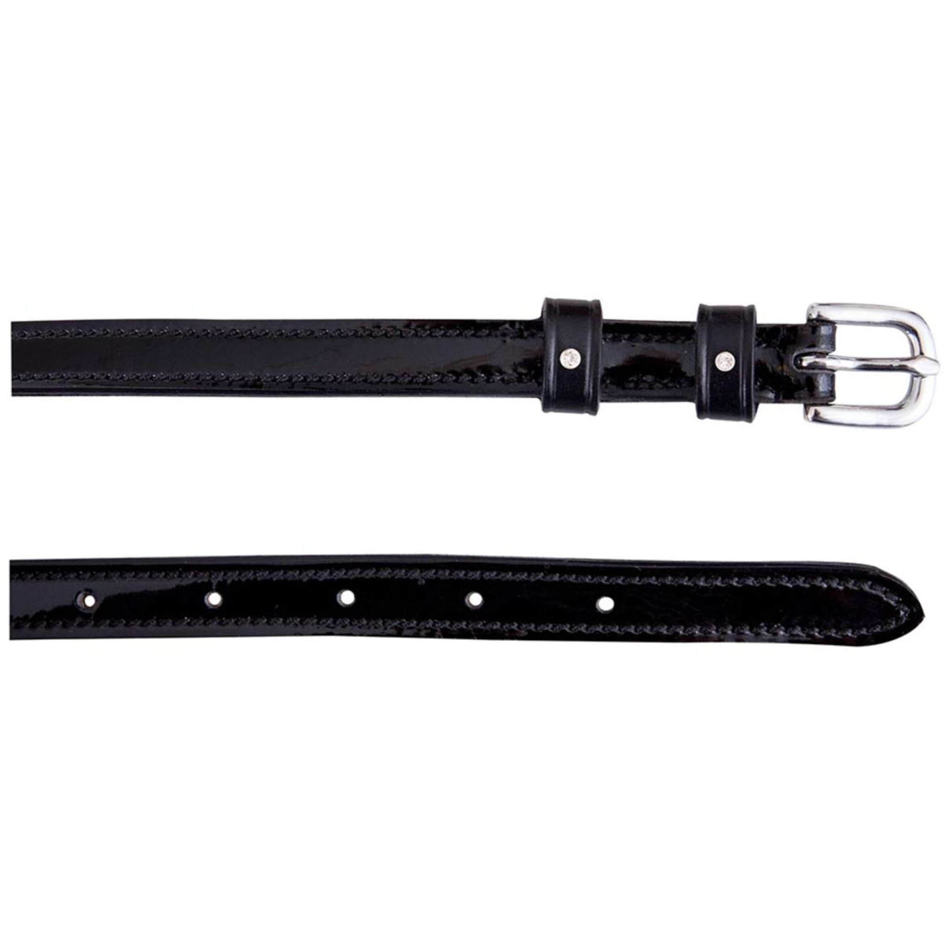 Ces lanières pour éperons en cuir verni ajoutent une touche d'éclat à votre équipement. Avec leurs deux passants ornés de cristaux Swarovski®, elles combinent élégance et fonctionnalité. D'une largeur de 12 mm et d'une longueur de 45 cm, elles s'ajustent parfaitement à vos éperons.