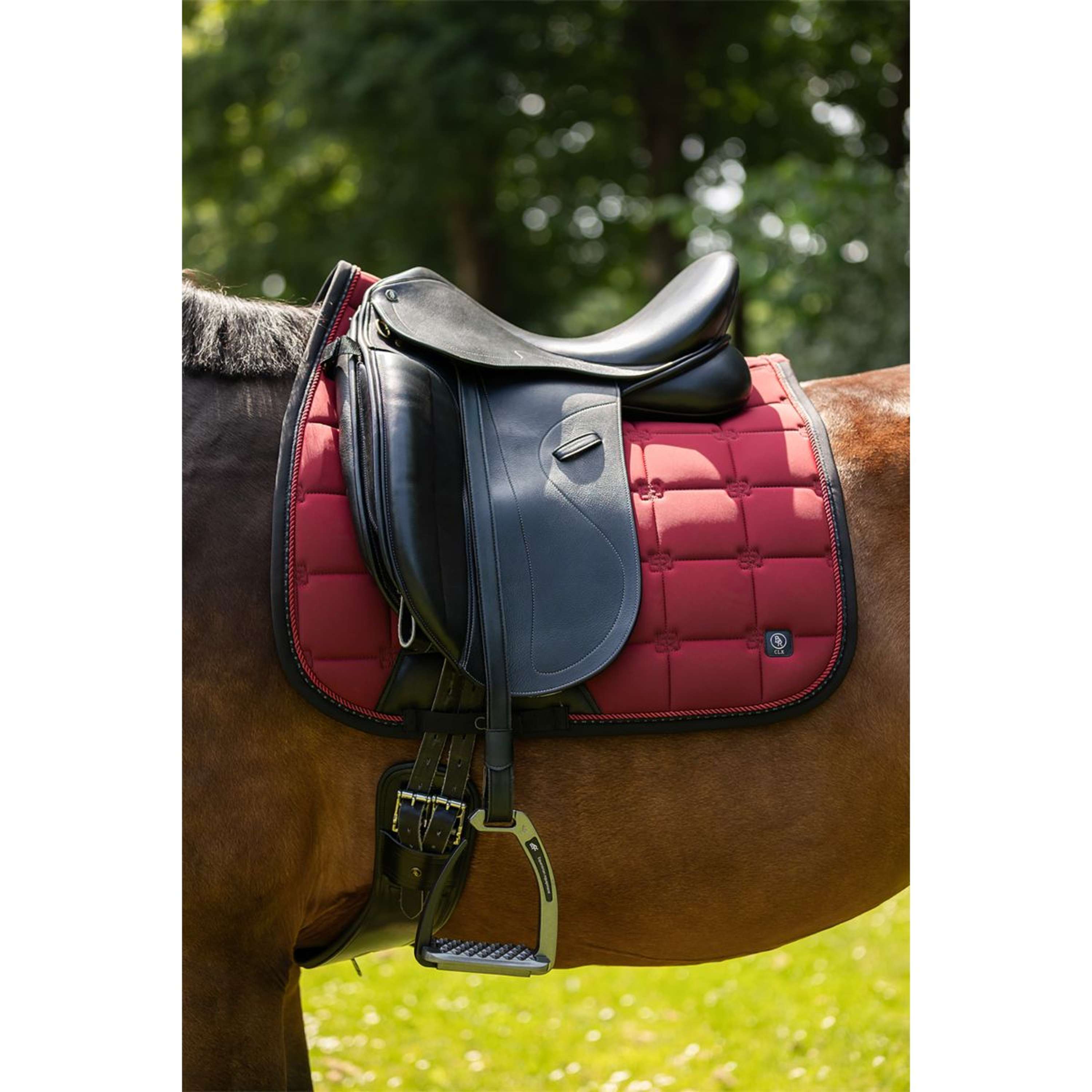Le tapis de selle CLX élégant est matelassé en carrés avec des surpiqûres du logo BR pour un style unique et fini avec deux passepoils subtils. Il dispose de passants de selle et de sangle réglables avec velcro et d’un renfort supplémentaire en cuir synthétique au niveau du passant de sangle.