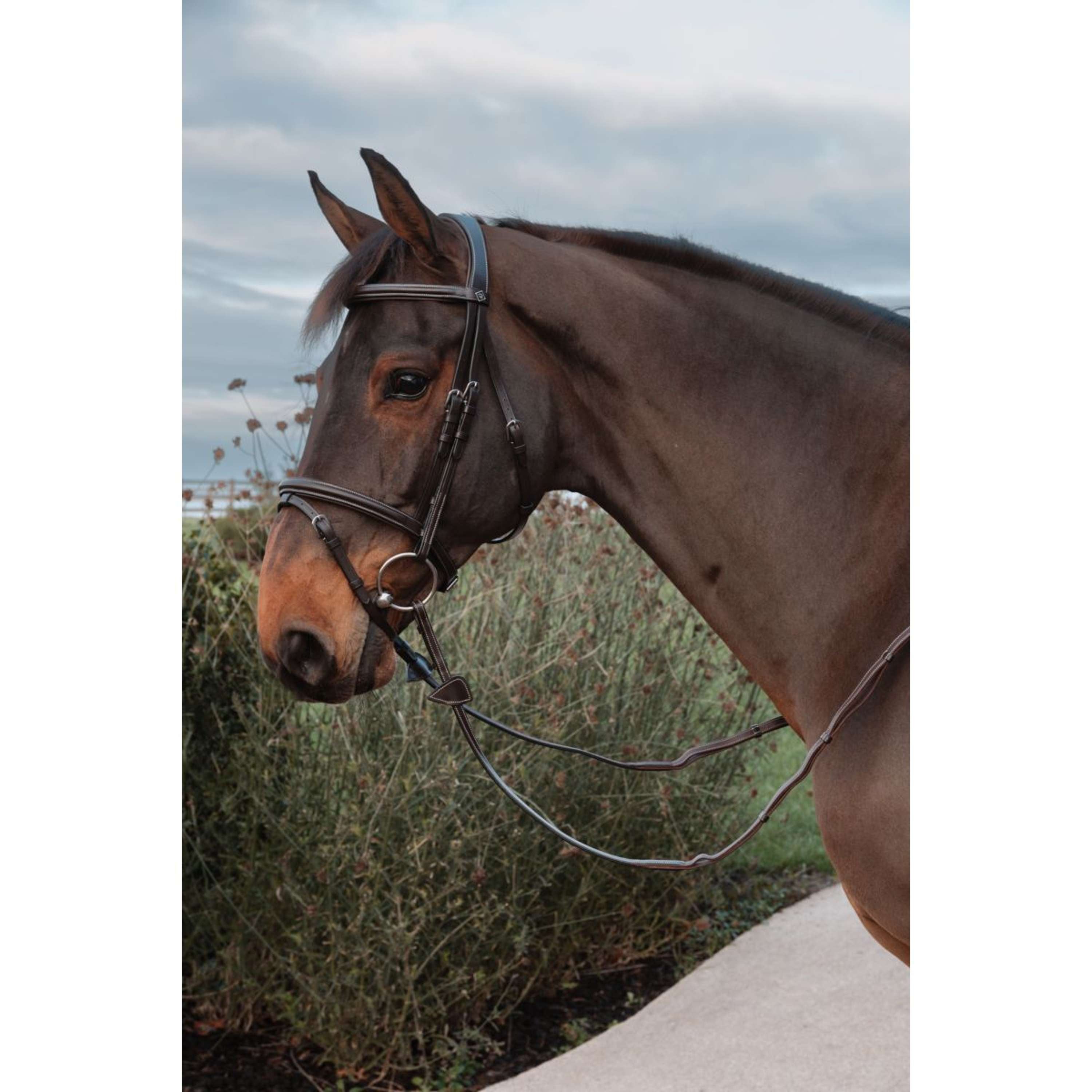 Les rênes font partie de la collection Working, ce qui signifie que la couleur des coutures est crème. Les boucles sont en acier inoxydable. Disponible en marron et noir.