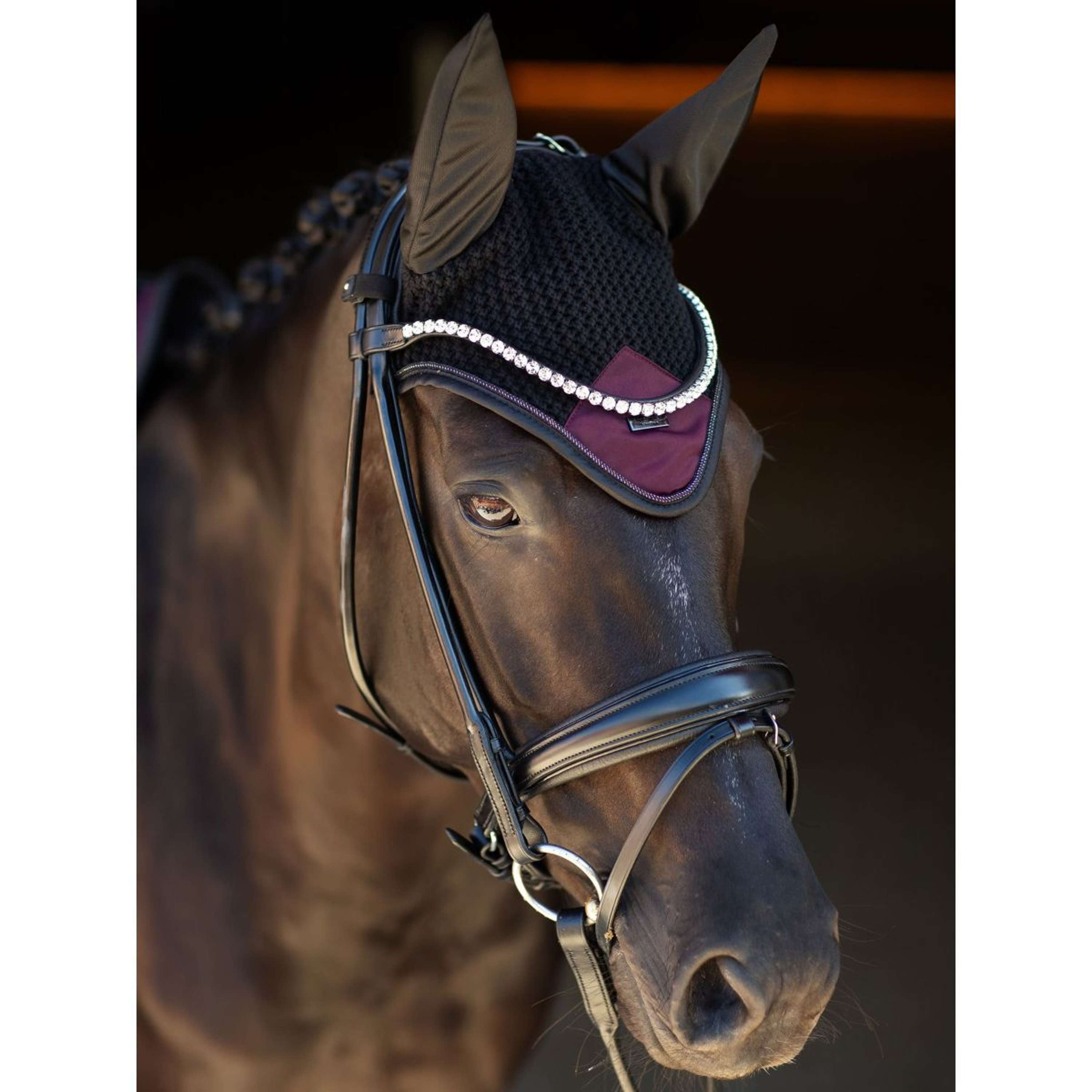 Un luxueux filet d’oreilles en crochet noir, orné d’un patch en satin violet foncé sur le devant, d’élégants passepoils argentés et d’un insigne noir de l’Équitation de Stockholm. Le capot d’oreille offre à la fois une protection contre les insectes et une atténuation du bruit ambiant. Le tissu élastique au niveau des oreilles apporte un confort supplémentaire. Ce moustiquet est parfaitement assorti au coussin de selle de la collection Purple Night.
