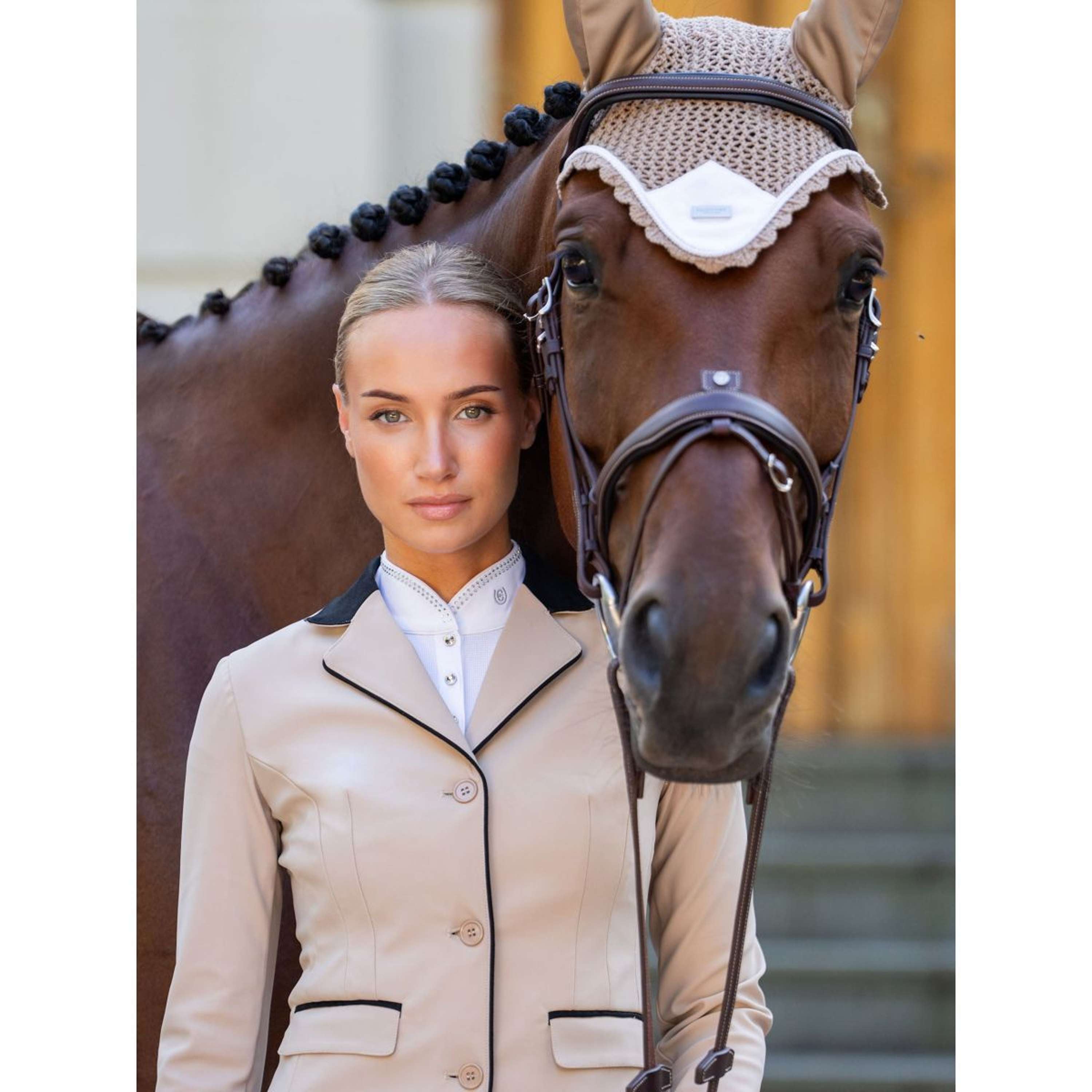 Mousset d’oreilles de luxe au crochet dans une teinte beige élégante. Décoré d’un patch en satin blanc sur le devant, d’un élégant passepoil blanc et argent et de l’emblème équestre argenté de Stockholm. Le filet auriculaire offre à la fois une protection contre les insectes et une réduction du bruit. Le tissu élastique au niveau des oreilles apporte un confort supplémentaire.