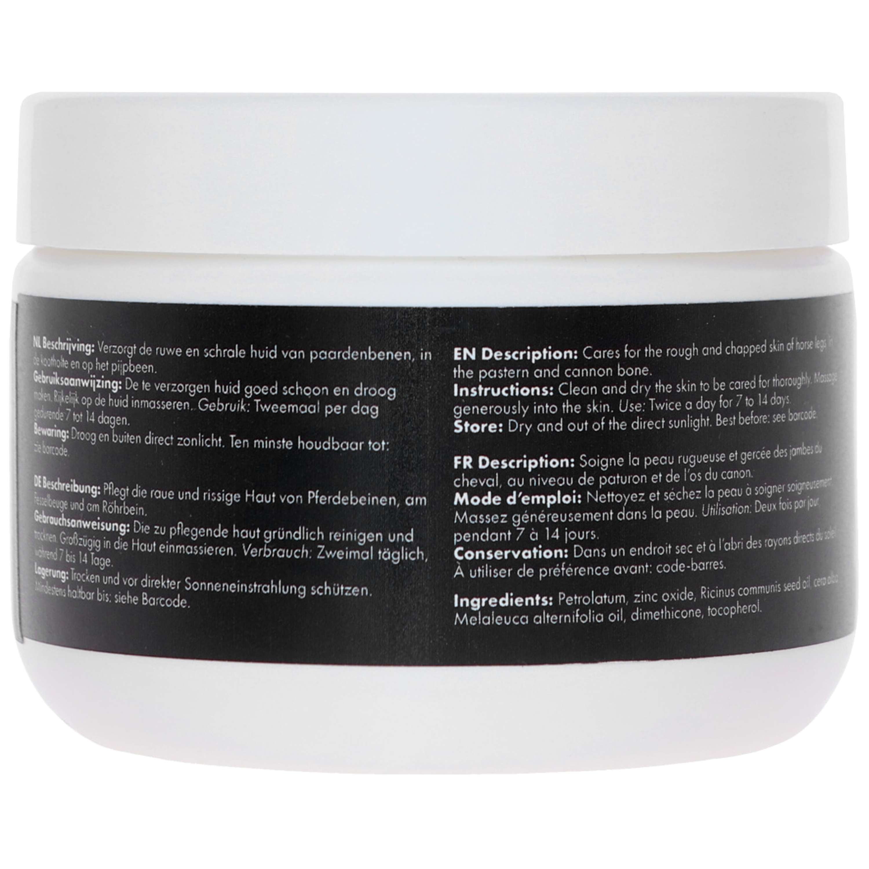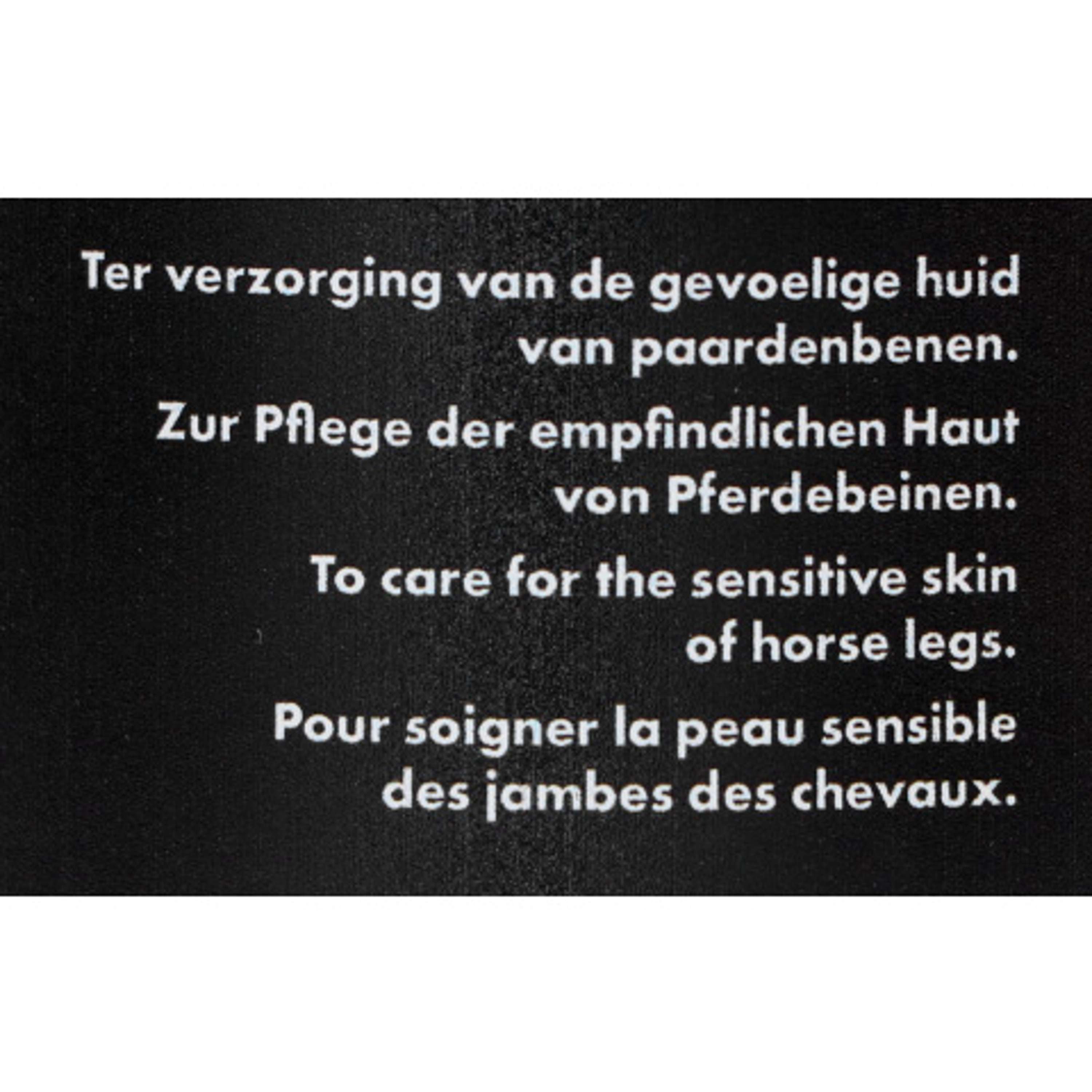 Soigne la peau rugueuse et gercée des membres, en particulier au niveau du creux du paturon et de l'os du canon. Apaise la peau sensible, la protège et l'hydrate du dessèchement.