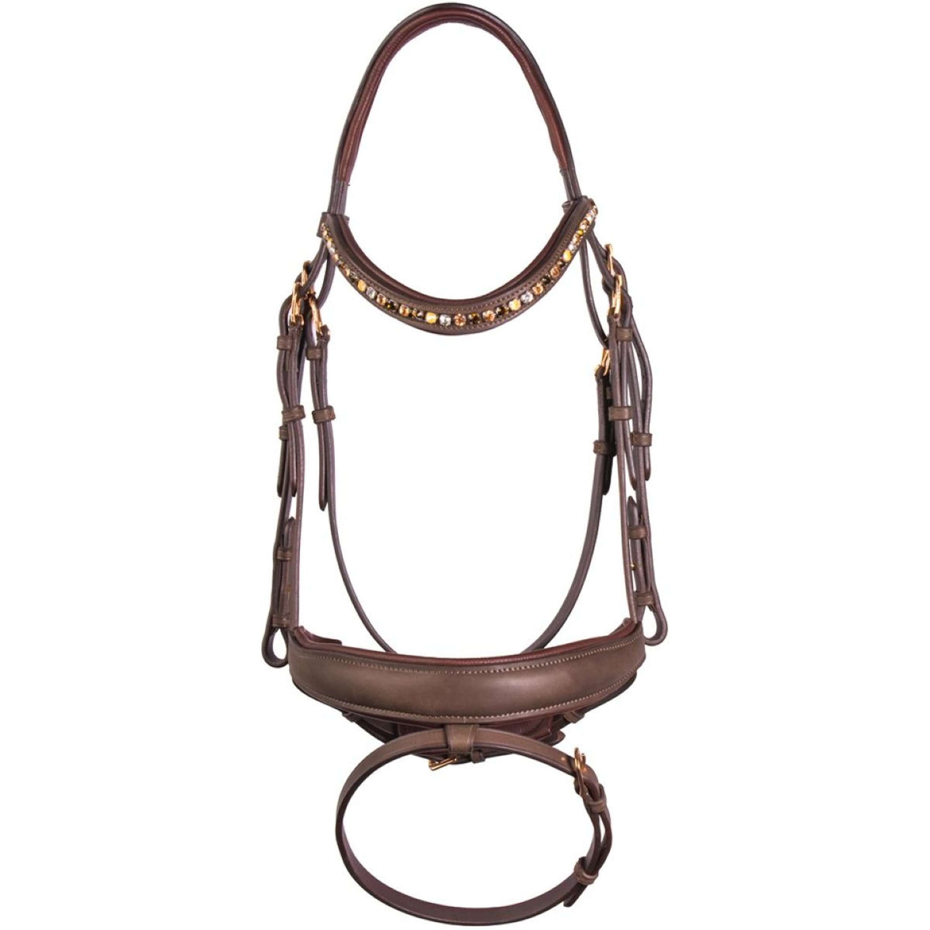 Bridon en cuir souple et confortable, doté d’un frontal anatomique et d’une muserolle combinée anatomique assortie. Le frontal est orné de cristaux aux quatre couleurs différentes et équipé de boucles couleur or rose. Livré avec des rênes munies de fermetures invisibles.