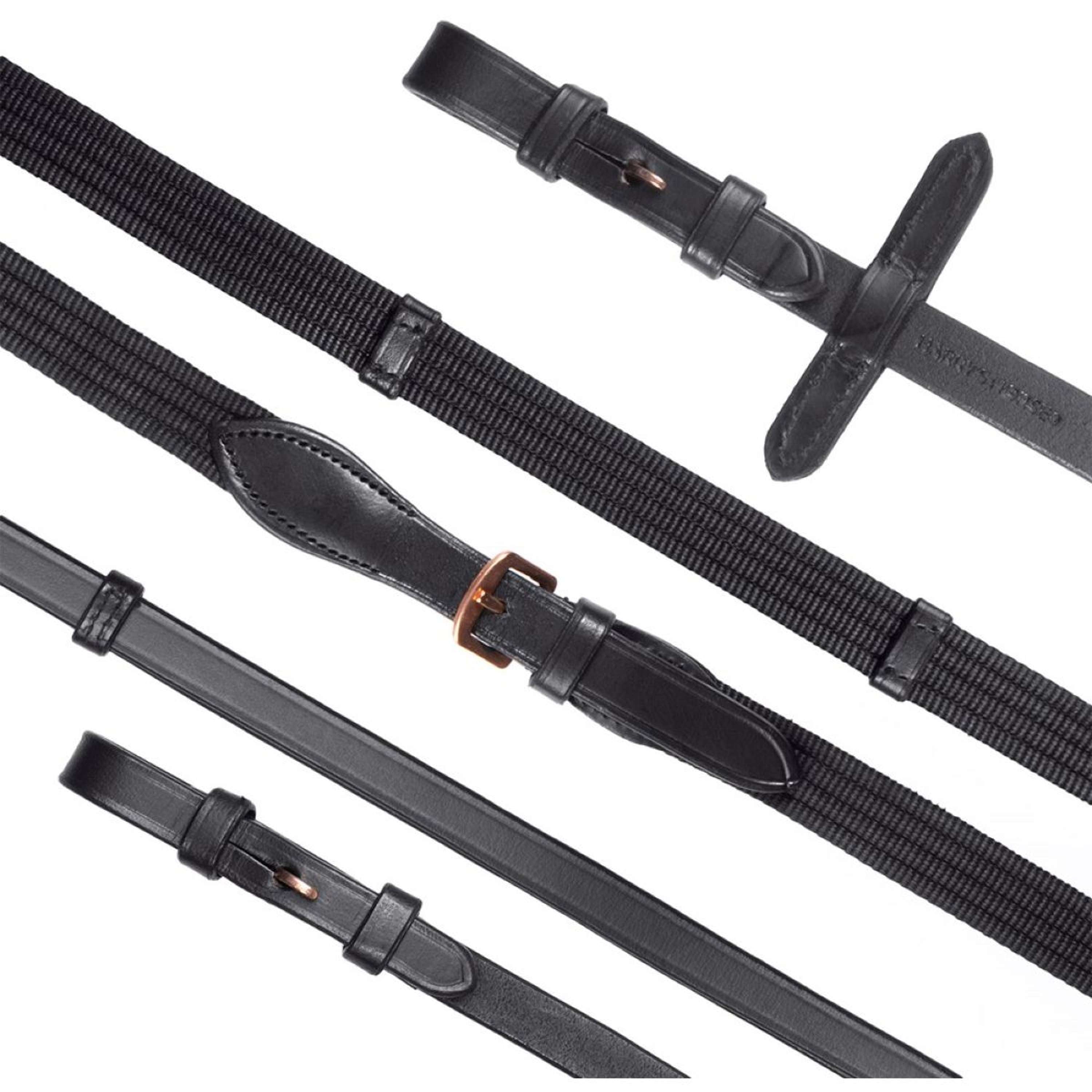 Bridon double en cuir de luxe avec muserolle combinée.La muserolle large en cuir verni, doublée de blanc, est anatomique. Le bridon est doté d’une têtière anatomique spécialement conçue et rembourrée de manière douce.Orné d’un frontal de luxe avec finition vernie et cristaux rose gold.Le bridon est livré avec une rêne en sangle et une rêne de bride en cuir.