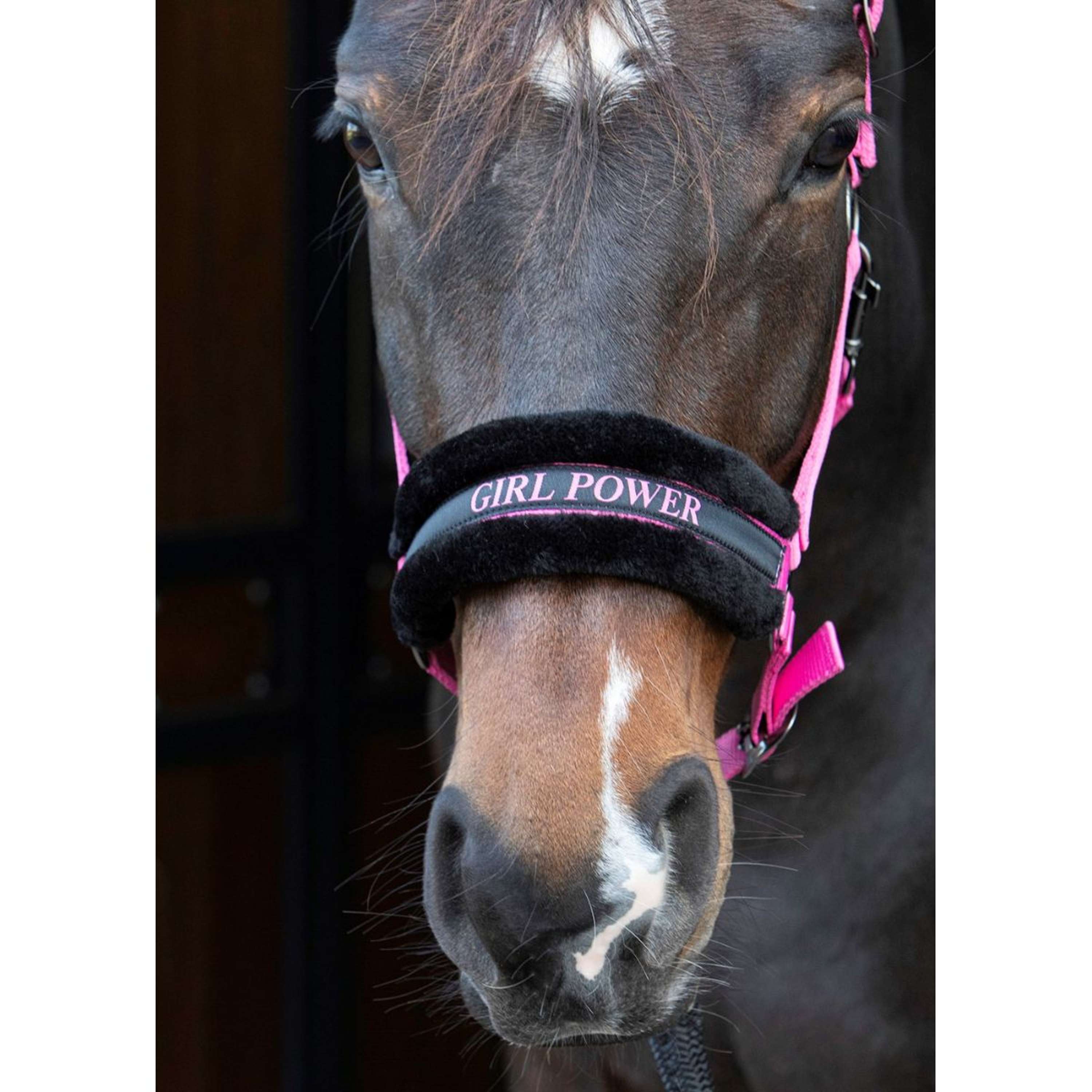 Licol avec texte amusant. Doublé de fausse fourrure noire douce. Réglable des deux côtés de la têtière et au niveau de la mâchoire. Les trous sont munis d'œillets.Noir : PARTNER IN CRIMEMarine : BORN 2 RIDERose : GIRL POWERLime : HEY BIG SPENDERLilas : IT'S A KIND OF MAGICFuchsia : SHINE BRIGHT LIKE A DIAMOND