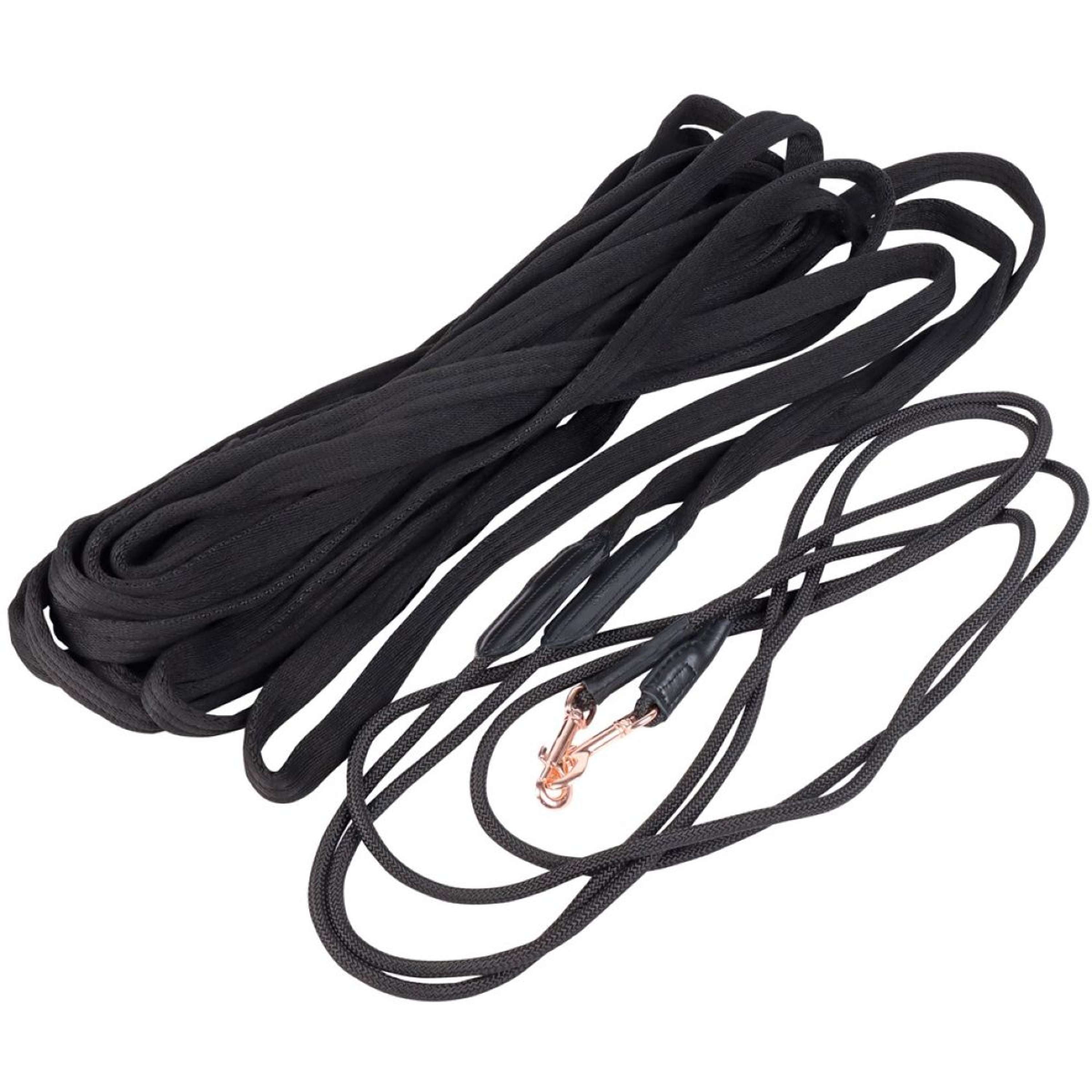Cette longe est composée de deux parties équipées de deux mousquetons couleur or rose. 1480 cm, nylon souple.