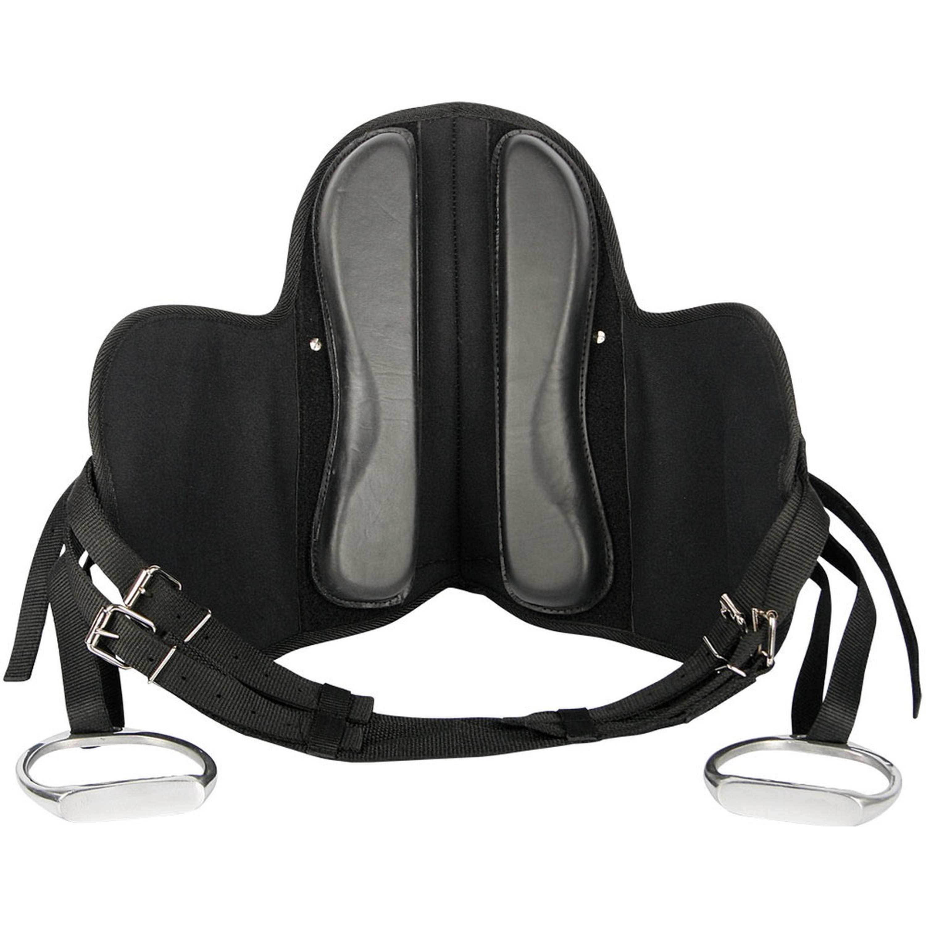 Bardette confortable et matelassée. Le pommeau et le troussequin sont surélevés pour plus de sécurité. Poignée en caoutchouc pour un bon maintien. Panneaux réglables et amovibles, anneau de croupière et contre-sanglons en nylon très robuste. 10"Vendue complète avec sangle (60 cm), étrivières en nylon (120 cm) et étriers légers (10 cm).