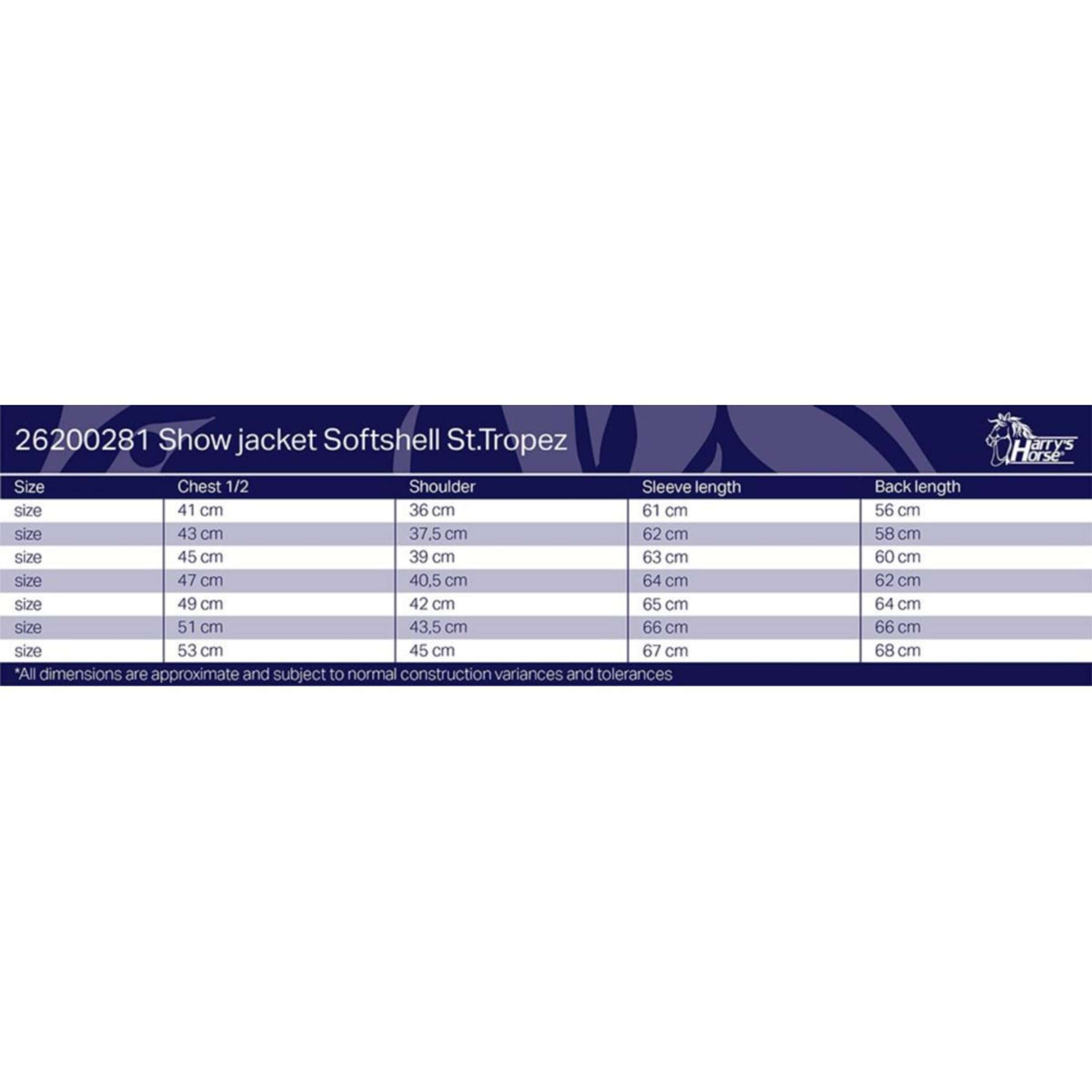 Veste de concours en softshell, doublée, cintrée, liseré sur le col, deux poches avant, fermeture à glissière aux poignets et deux fentes à l’arrière. Respirant et déperlant. 100% polyester Softshell.
