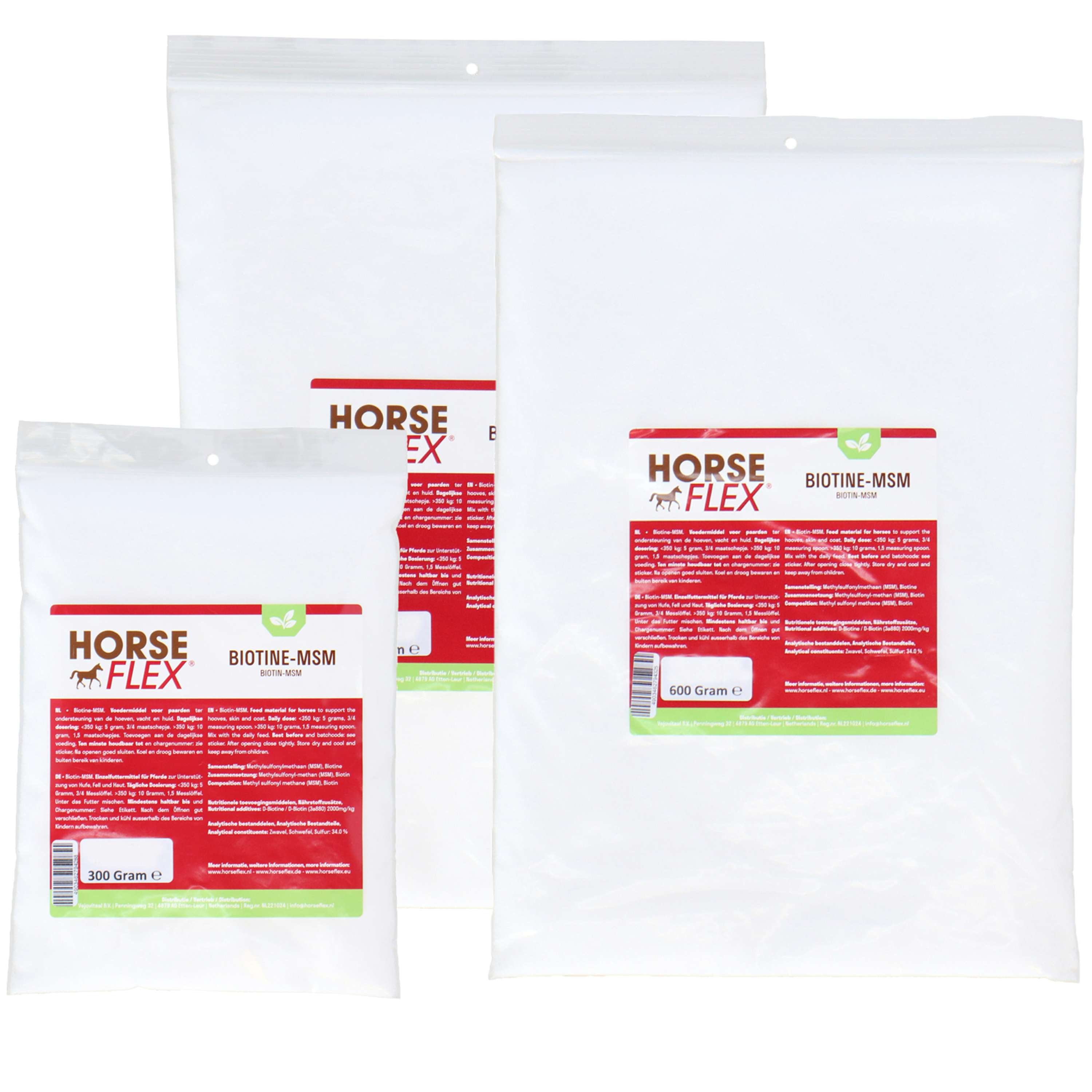 Ce produit contient une combinaison de MSM et de biotine pure. La biotine influence positivement le développement de la kératine, la base de la peau, des poils et des sabots de votre cheval. Le MSM, composé principalement de soufre, soutient la liaison du collagène et la bonne circulation sanguine.