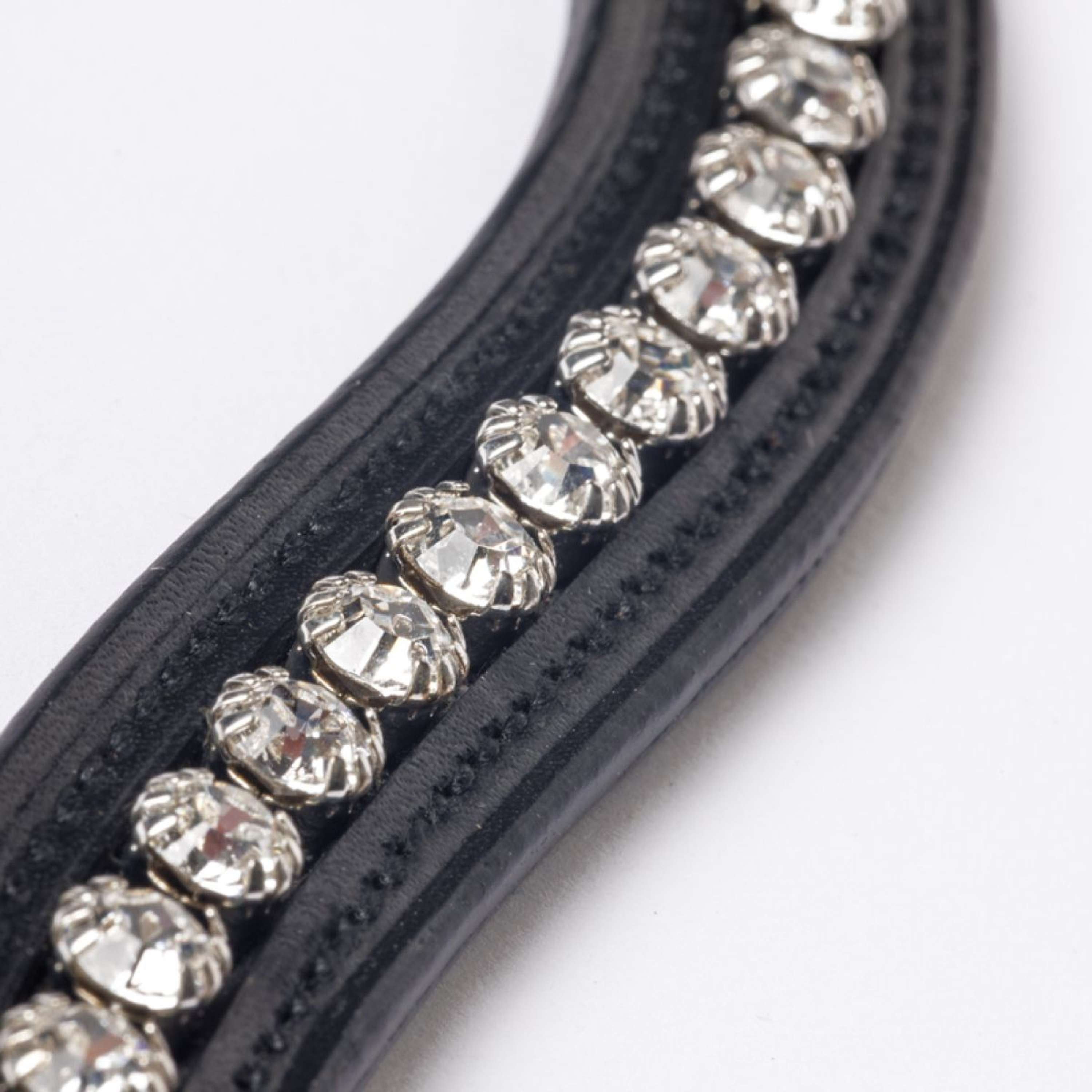 Ce frontal incurvé est décoré de magnifiques strass blancs qui captent la lumière de manière spectaculaire. Un accessoire parfait pour mettre en valeur la beauté naturelle de votre cheval tout en ajoutant une note sophistiquée à votre équipement.
