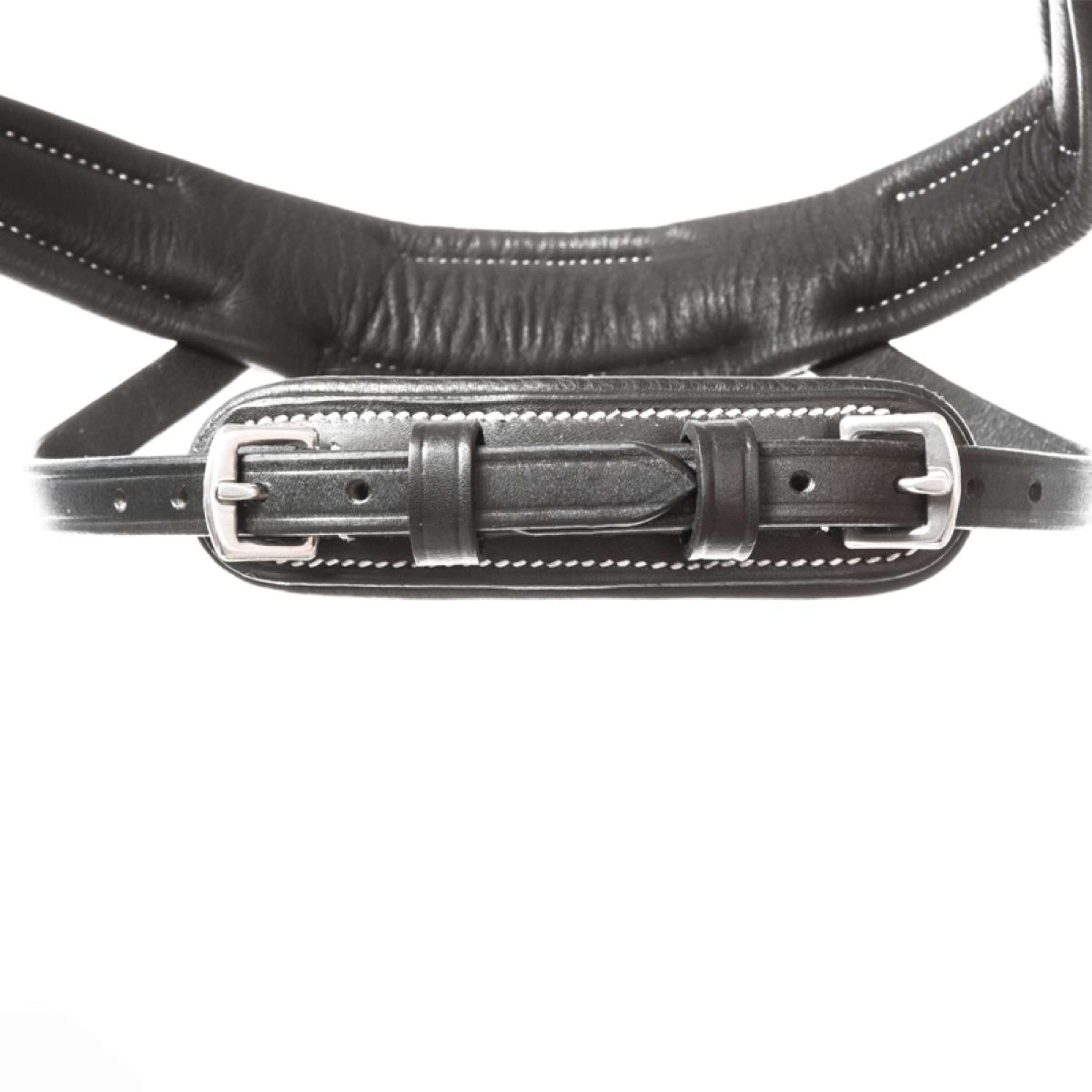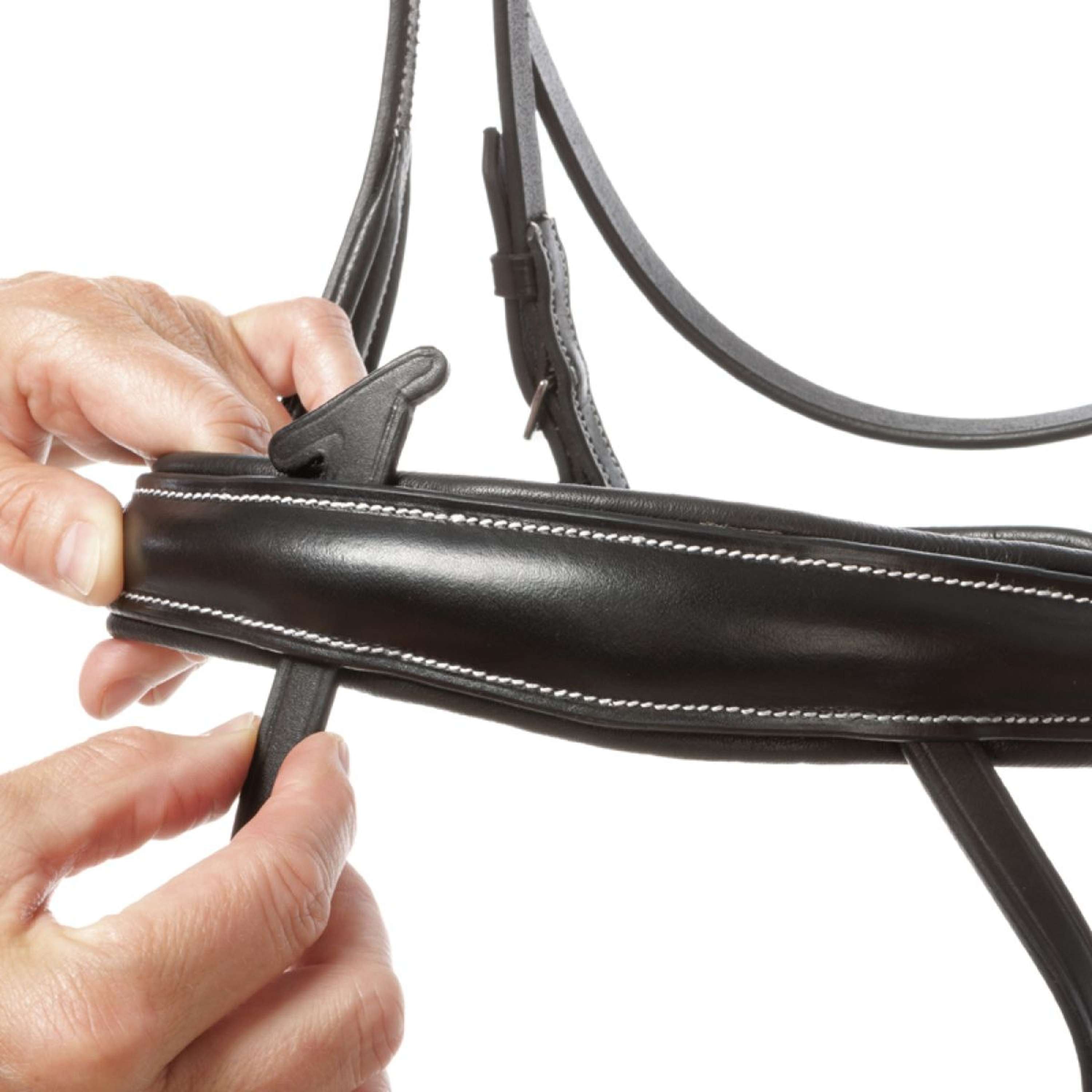 La têtière est extra large et incurvée, offrant ainsi une grande liberté d'oreilles et un ajustement optimal. Le frontal simple et incurvé ajoute une touche élégante et pratique, avec des coutures contrastantes et une broderie décorative qui accentuent le look raffiné de ce bridon.