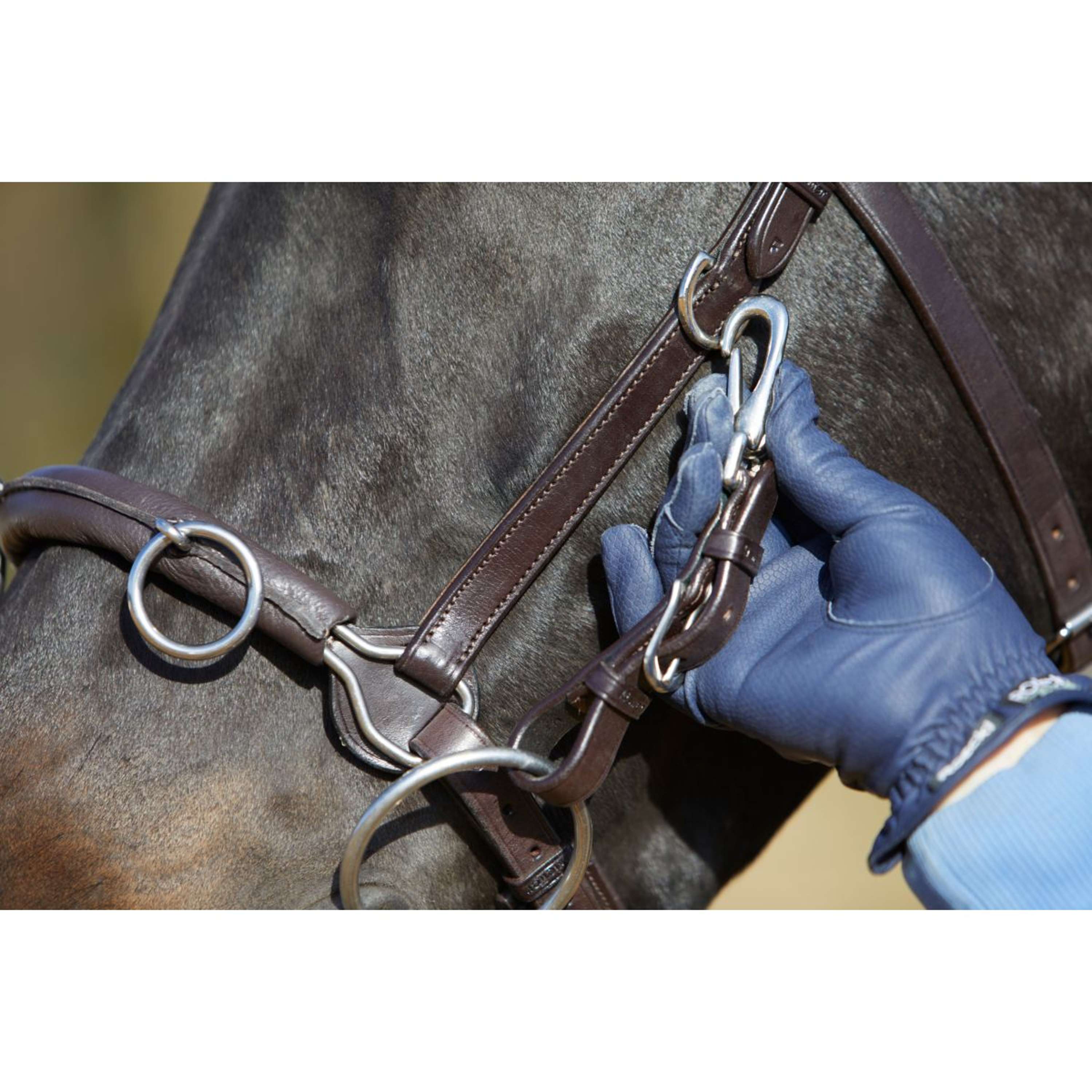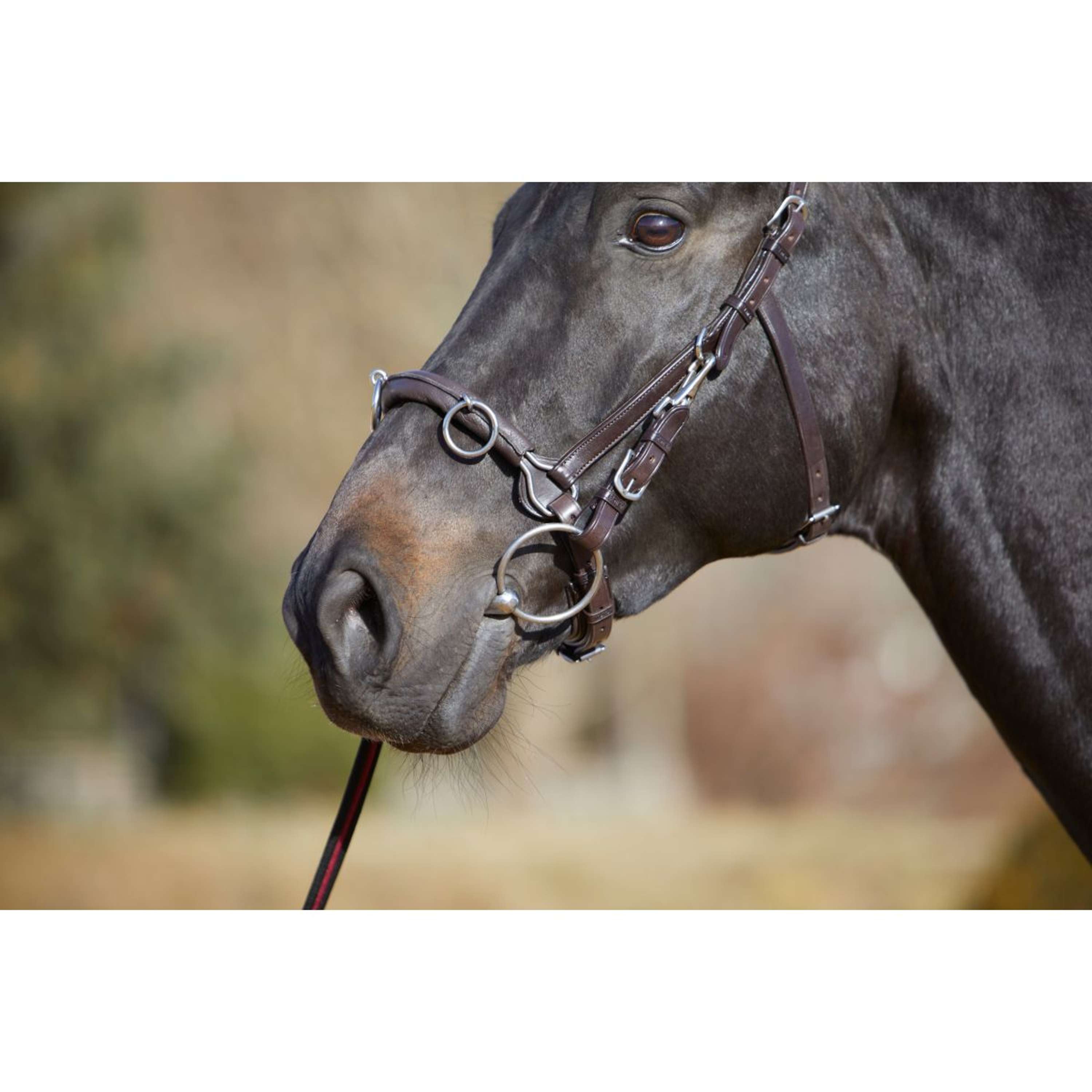 Avec trois anneaux mobiles sur la muserolle, tu as de nombreuses options pour les rênes. De plus, les sangles de mors incluses permettent de fixer un mors, rendant ce caveçon vraiment polyvalent pour divers exercices au sol.