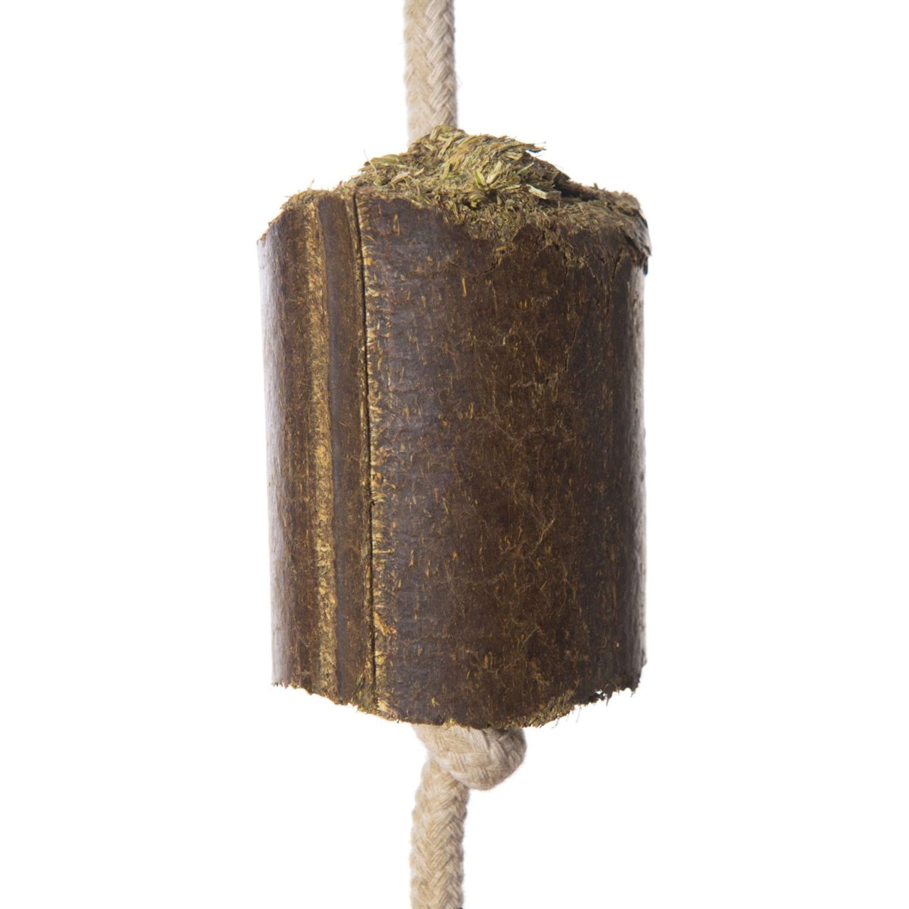 Les briquettes de luzerne sont enfilées sur une corde solide. Vous pouvez facilement les accrocher dans le box ou à l'extérieur. Cela permet à votre cheval de s'occuper de manière ludique, tout en gardant son espace propre et sans poussière.