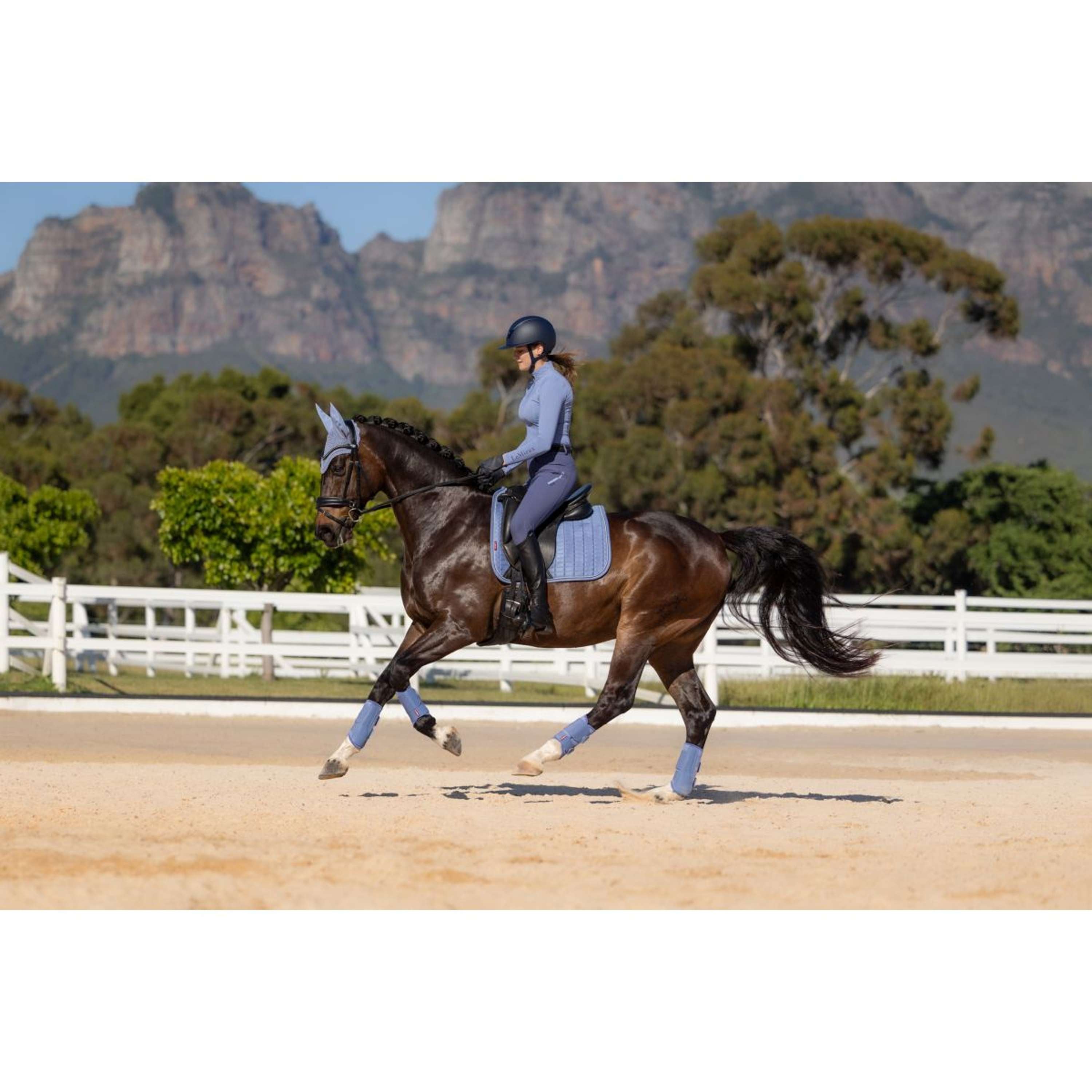 Associez votre tapis de selle de dressage en daim à une capuche anti-mouches classique de la même couleur pour un ensemble harmonieux.