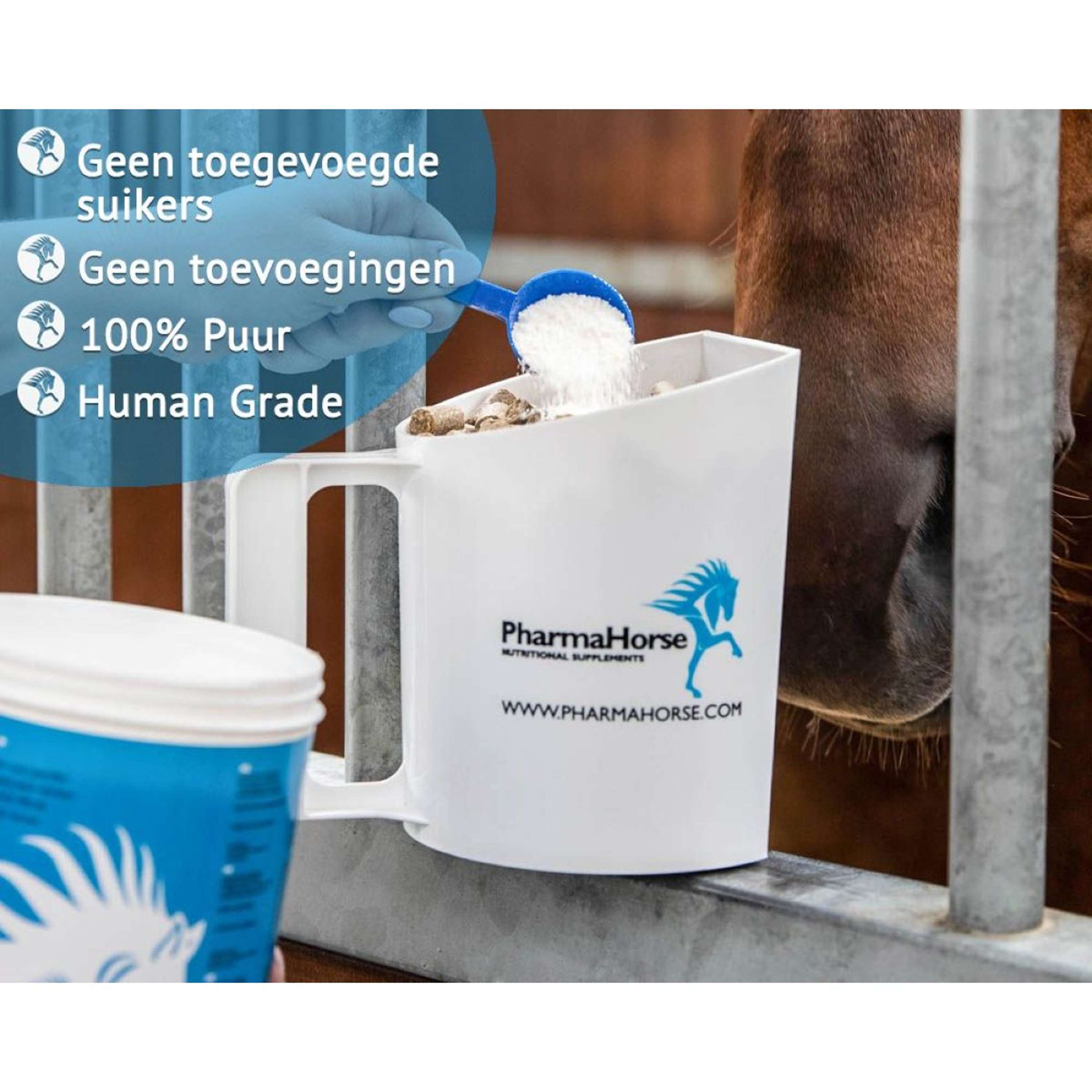 Le dosage recommandé est simple : une cuillère doseuse par jour pour un poney (± 300 kg) et deux cuillères doseuses par jour pour un cheval (± 600 kg). Chaque cuillère doseuse contient environ 5 à 6 grammes.