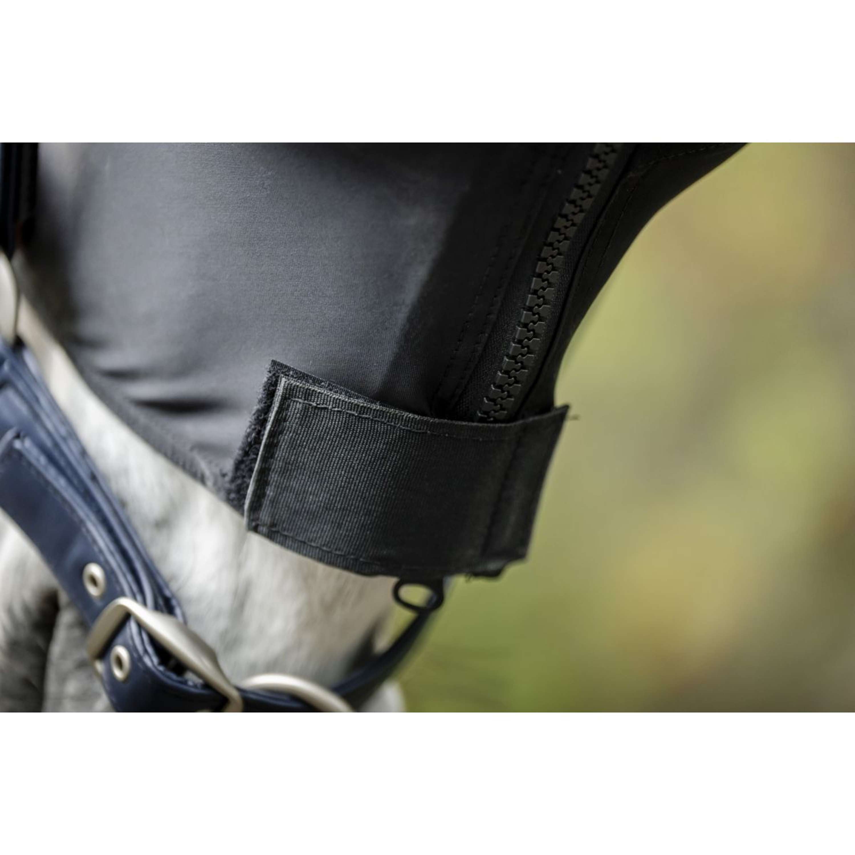 Système de fermeture éclair facile à utiliser avec protection zippée renforcée pour le visage, le cou, sous la poitrine et le rabat du ventre avec une simple fermeture velcro pour les pattes arrière.