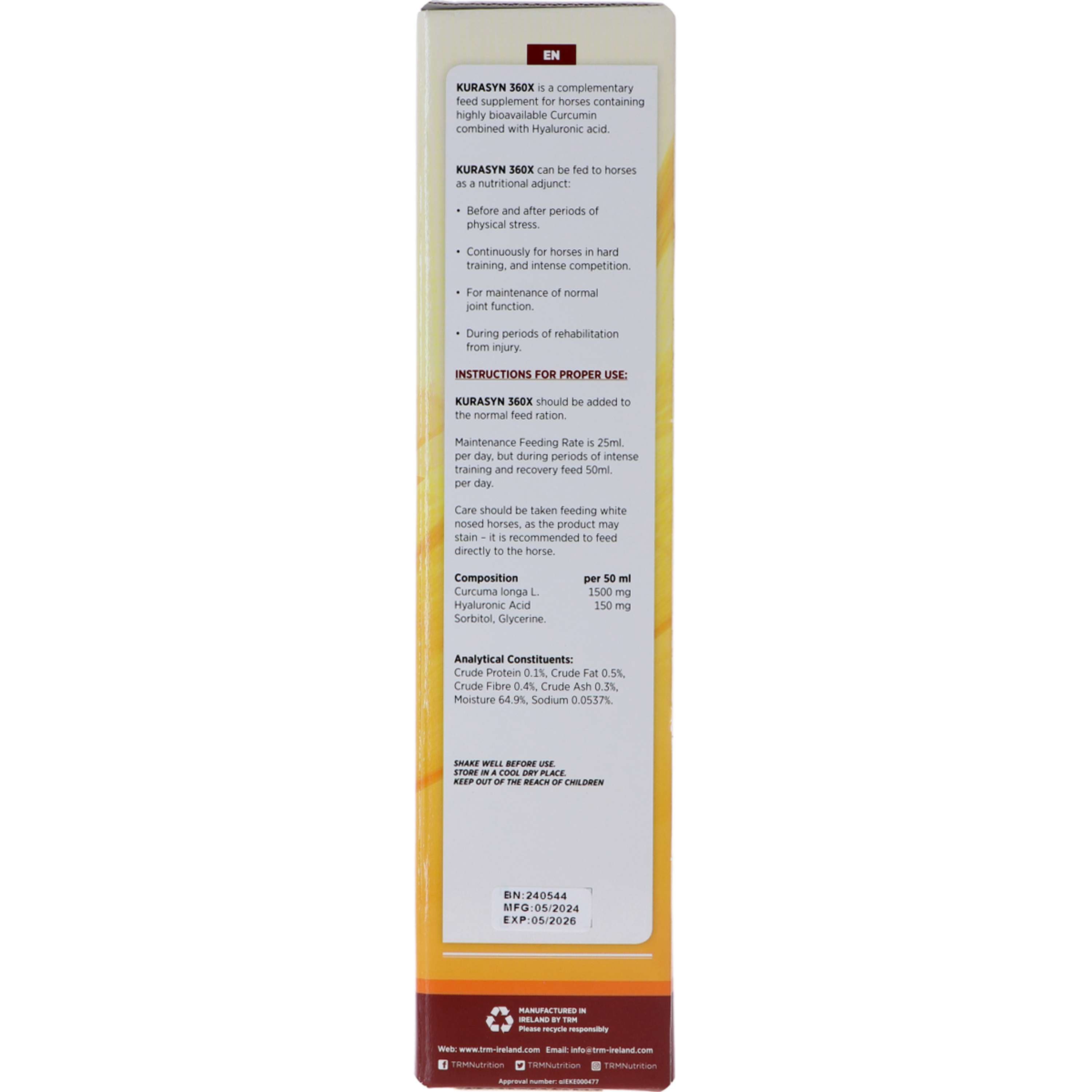 Imaginez un supplément qui pourrait vraiment aider votre cheval. Le TRM Kurasyn 360x est exactement ce dont vous avez besoin. Ce supplément contient du curcuma à biodisponibilité élevée et de l'acide hyaluronique. Grâce à sa formule unique, il est bien mieux absorbé que le curcuma classique.