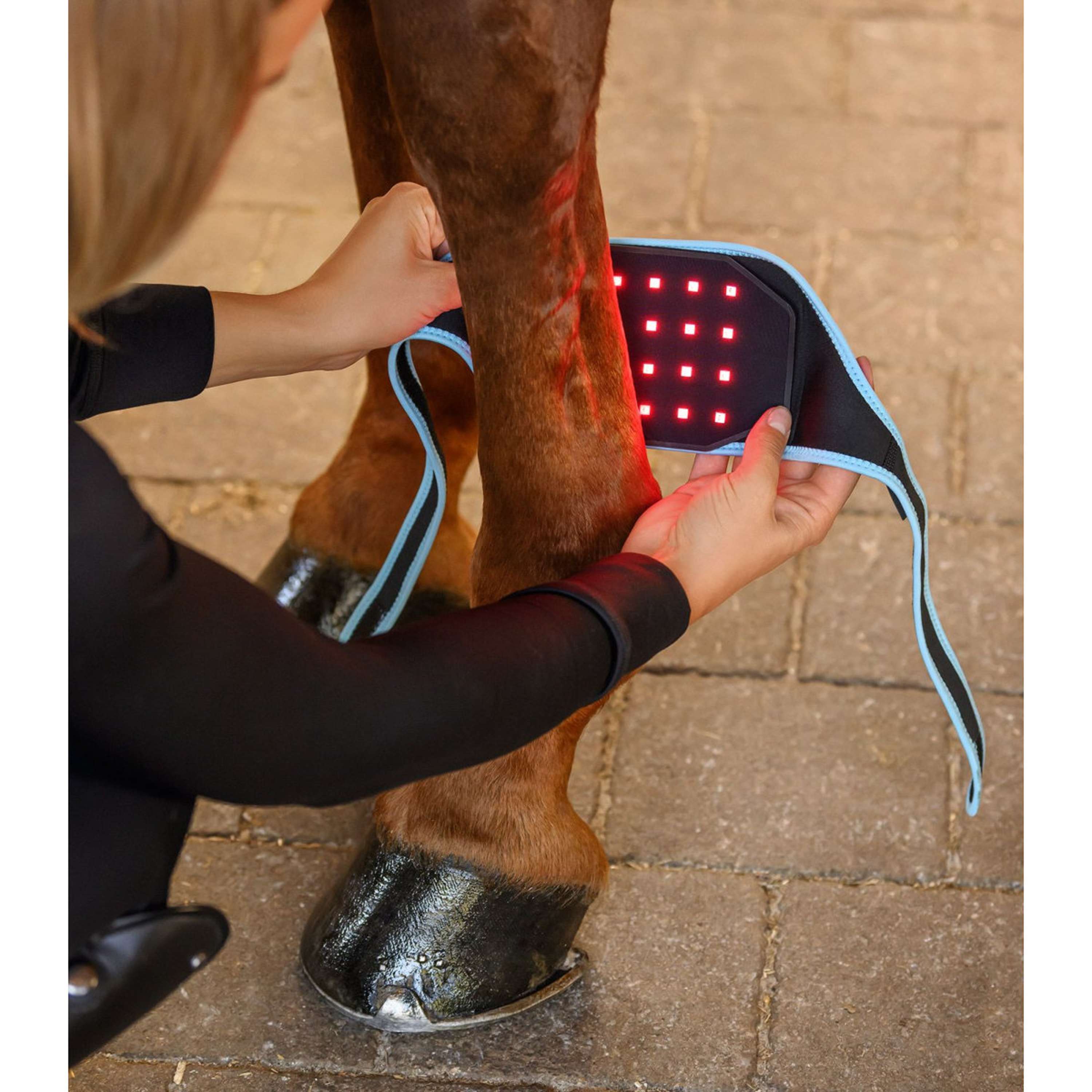 Le Waldhausen Health + Care Infrared FlexPad est une solution innovante pour favoriser la détente musculaire, la circulation sanguine et la régénération. Grâce à la chaleur profonde ciblée, la musculature du cheval est réchauffée en douceur, les tensions peuvent être soulagées et le métabolisme est stimulé. Le pad est particulièrement adapté au soutien avant l"entraînement, à la relaxation après l"effort ou à la thérapie d"accompagnement en cas de problèmes musculaires. Les trois fonctions peuvent être contrôlées individuellement : Intensité lumineuse infrarouge : 3 niveaux Spectre : 660 nm + 850 nm, Niveau d"irradiation 1 : 11 mW/cm² Les deux straps de fixation permettent d"utiliser l"Infrared FelxPad sur la jambe ou la nuque - pour de multiples possibilités d"utilisation.