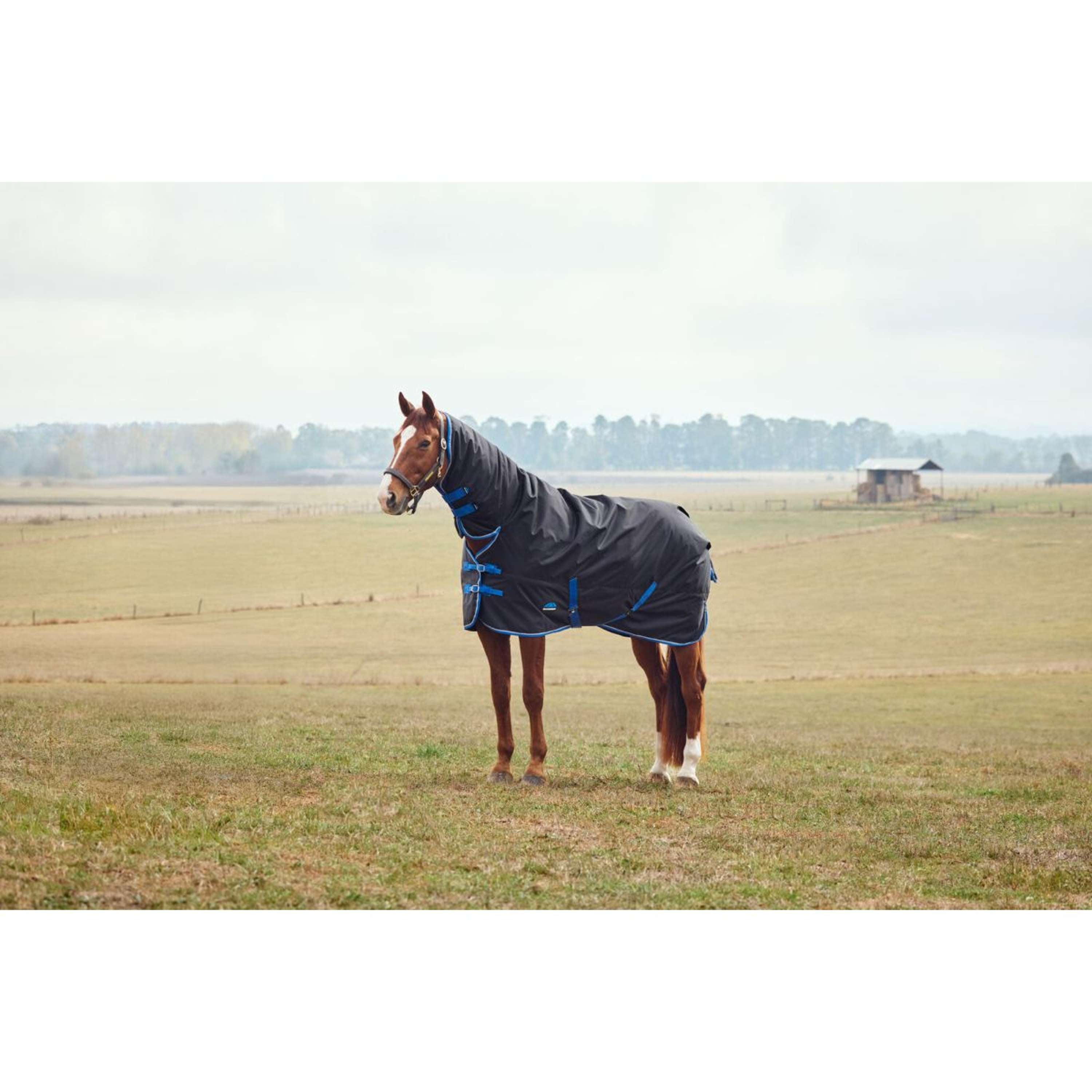 • Haute visibilité : Les bandes réfléchissantes et le marquage améliorent la visibilité, facilitant le repérage de votre cheval la nuit. La jauge de température et le badge denier aident à identifier le garnissage de la couverture.